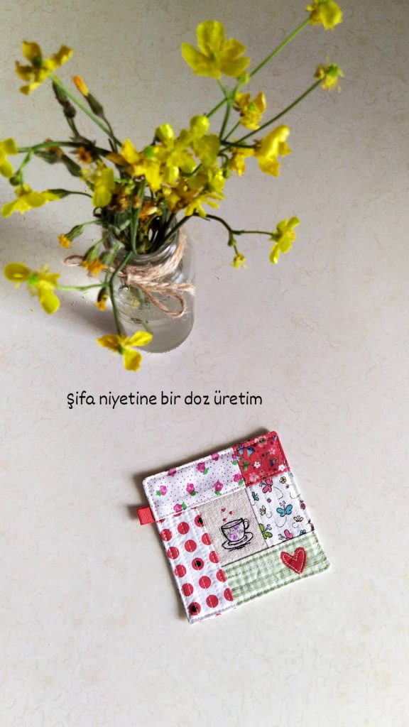 Nisan ayında diktiğim şirin bir bardak altlığı bu. Dikiş dikmeye vakit kalmıyor, zaten makinem de bozuk deyip her şeyi bıraktığım bir dönemdi. Ama dikme isteğim baskın geldi, makineyi çalıştırdım ve çok vakit almayacak bir şey dikeyim derken Zeriano‘nun bardak altlarından birini denemek istedim. Çok fazla ölçüp biçmeden, gelişigüzel diktiğim bir parça oldu.