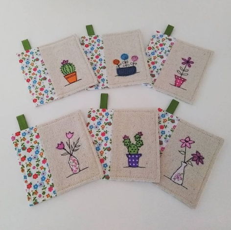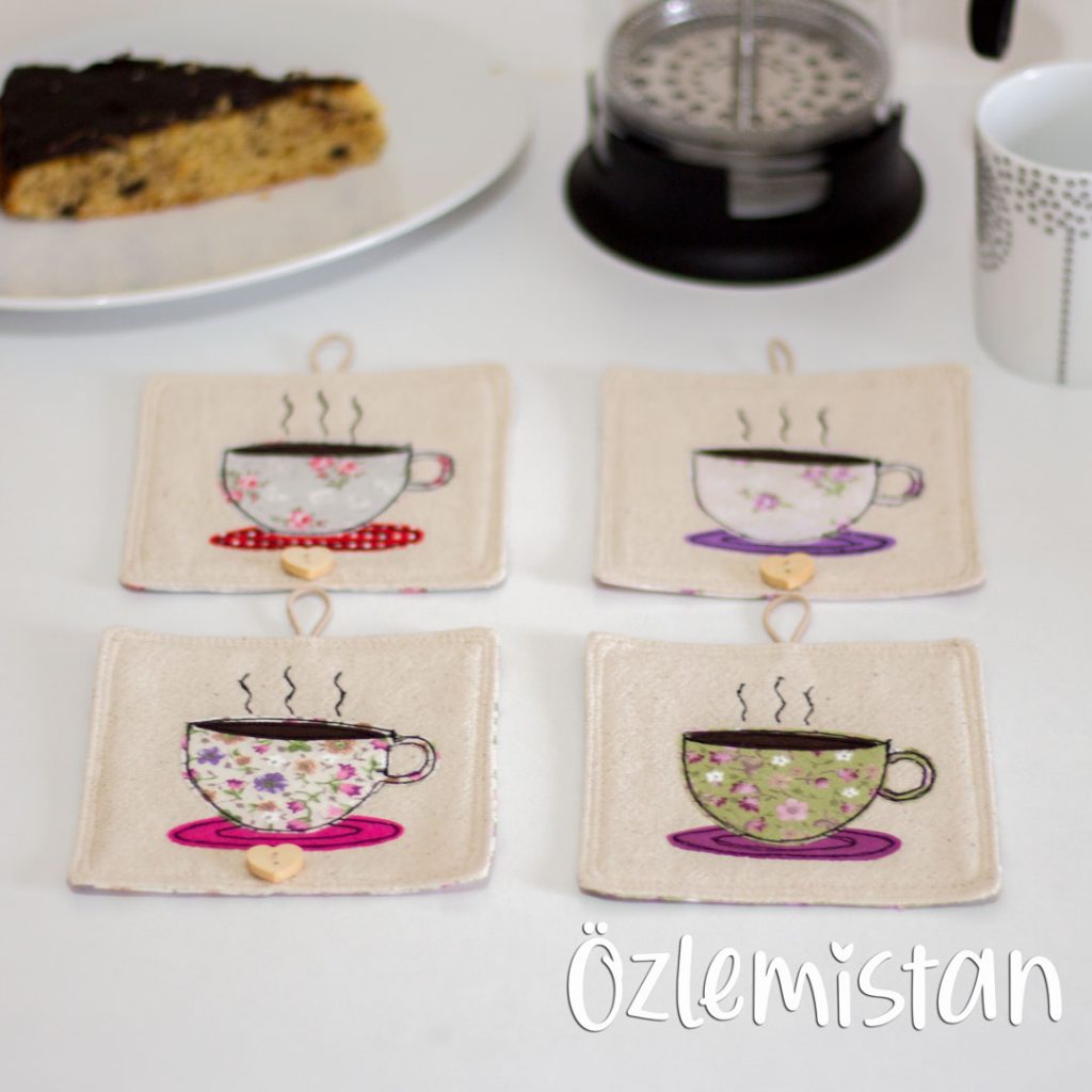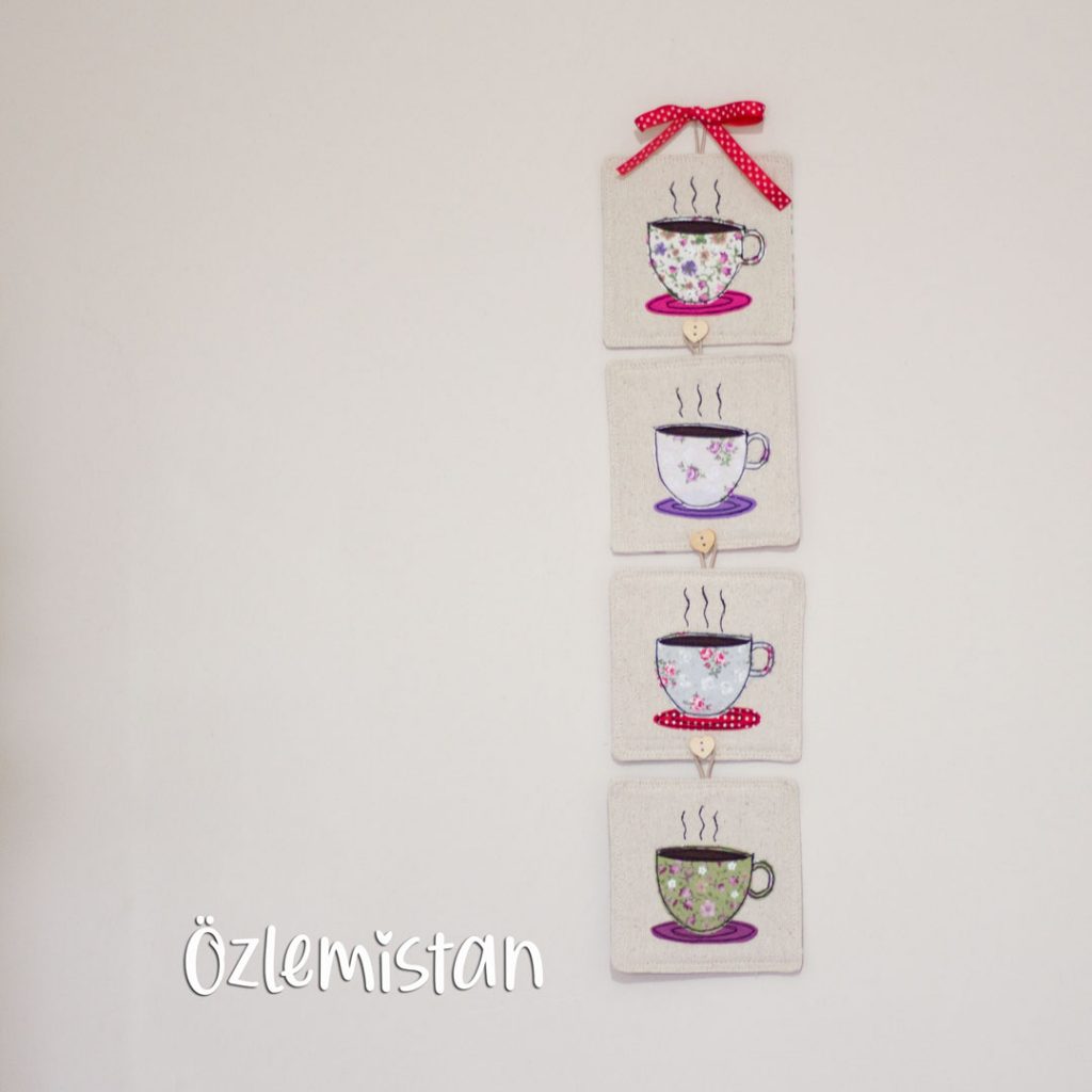 Daha sonra da şunları diktim ve halen evde kullanıyorum. Duvara asılabiliyor olmaları bence çok güzel fakat şu an her parçasını evde keyif yaptığım bir köşeye bıraktım. Elimde fincanımla gittiğimde hemen kullanıma hazır oluyor 😀