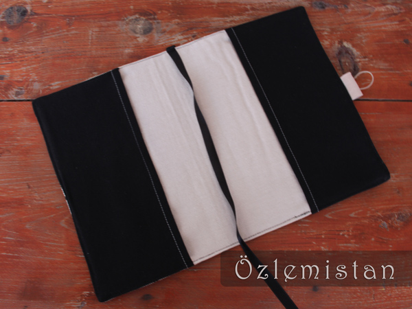 Kumaşın renklerine uygun olarak siyah ve bej haricinde renk kullanmadım ve bu kez istek üzerine kulpsuz çalıştım. Bence bu “mektup kitap kılıfı” kitapsever erkekler için de gayet ideal 🙂
