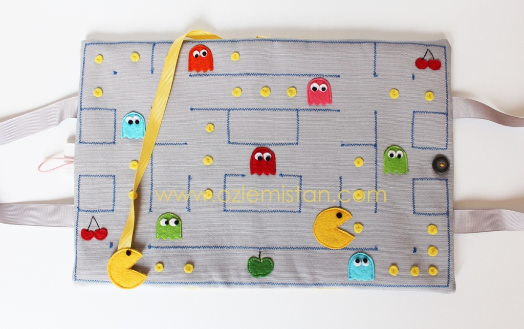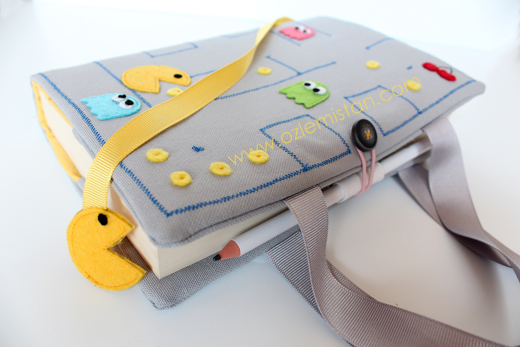 Oyunun ekran görüntsünü kumaş üzerine dikiş ve renkli keçelerle resmetmeye çalıştım. Bence gayet de güzel oldu. Renkler ortaya çıksın diye gri zemin kullandım. Kitap kılıfımızın özellikleri standart: