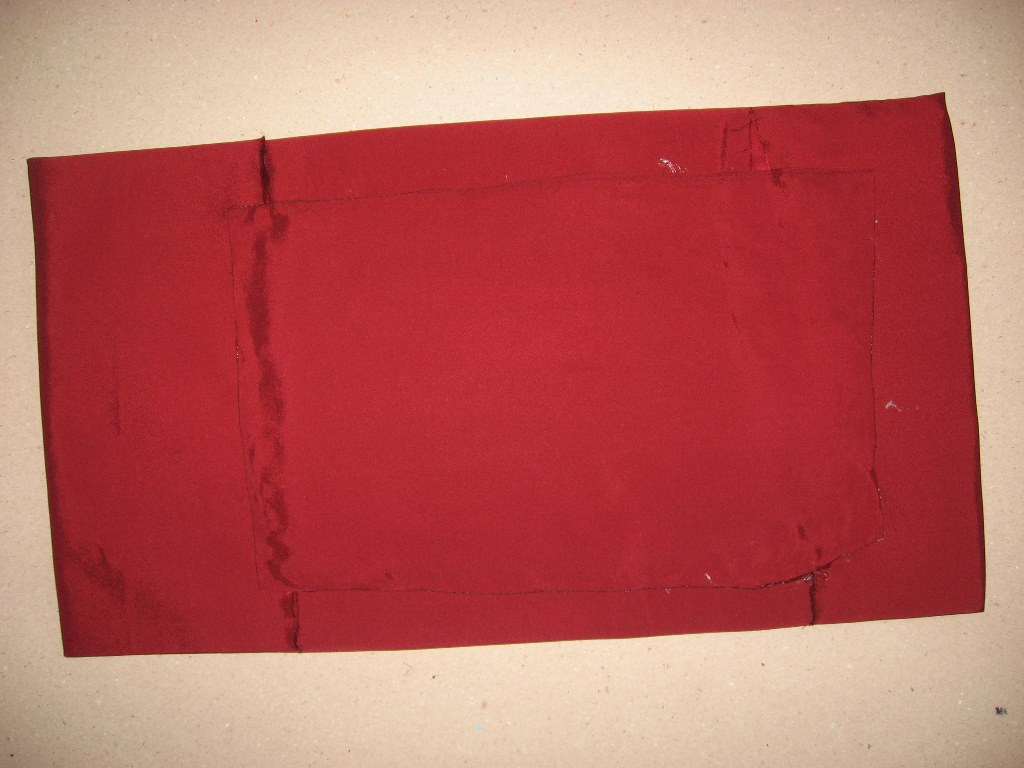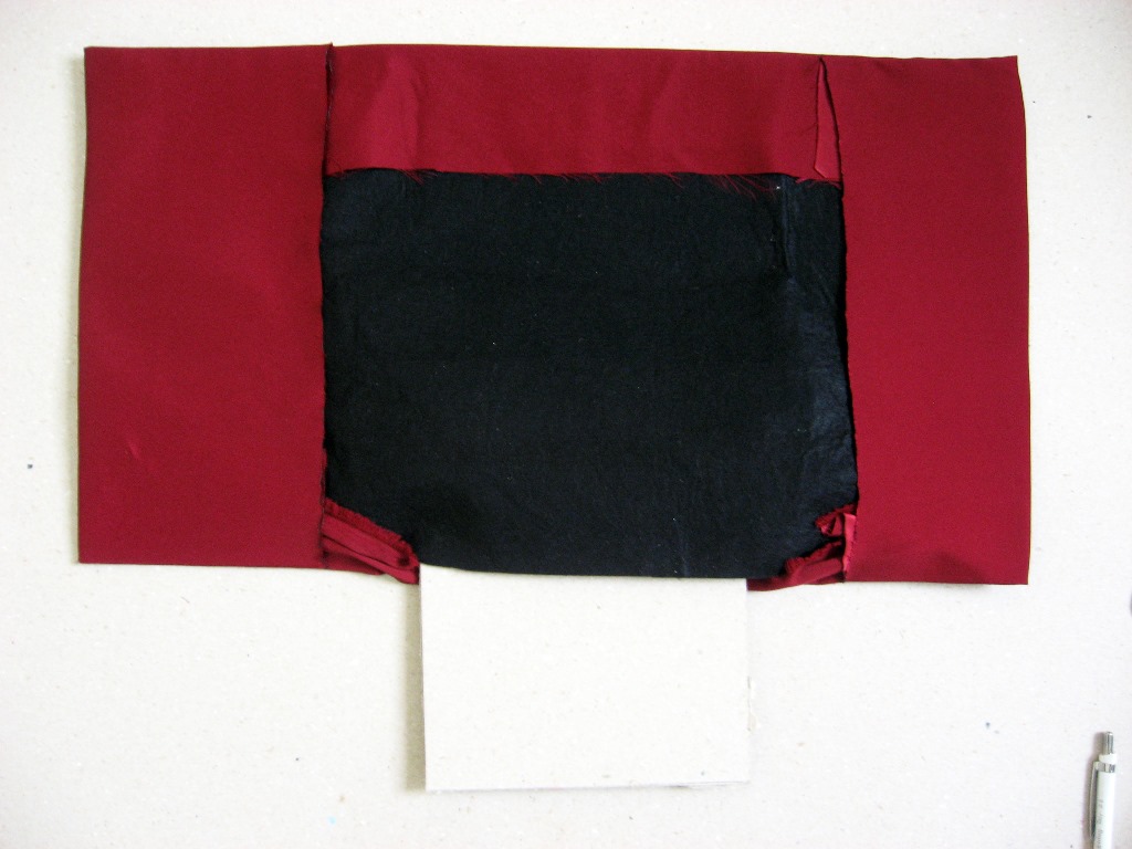 Katlanan yer kapak bölümünü tamamen örtse iyi olur. Şimdi diktiğimiz bölümleri dışına çevirip içine keçeyi yerleştiriyoruz. Dik dursun diye 26 x 18 cm ebatında bir parça mukavvayı orta bölüme keçeyle saten arasına yerleştirdim. Şart değil tabi bu.