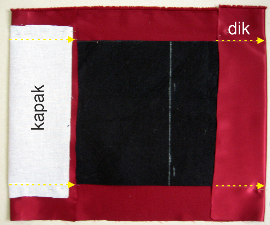 Şimdi buna göre daha büyük olacak şekilde kumaşı kesiyoruz ve telalıyoruz. Kumaşın yüzü yukarı bakacak şekilde serip üzerine keçeyi yerleştiriyoruz. Kısa kenarlardaki fazla kumaş paylarını keçenin üzerine doğru yatırıp keçenin uzun kenarlarının hizasından dikiyoruz. (keçeyi çıkarıp dikin) Şöyle: