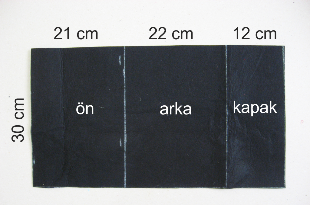 Bu çalışmada dikiş çok az var, vaktim dar olduğundan uydura uydura yapıştırarak yaptım genelde. Önce istediğimiz ölçüye göre keçeyi kesiyoruz. Benimki şöyle: