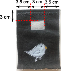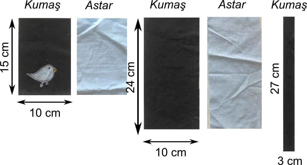 1. Şekilde görülen ölçülerde parçalarımızı kesiyoruz. Ben astar kumaşından bir tane de mavi kuş kondurdum küçük parçanın üzerine. Daha farklı şeyler de yapılabilir tabii ki.