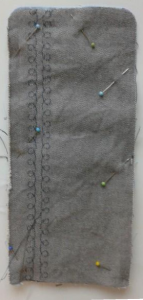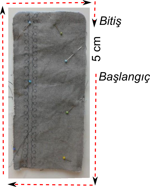 7. Oluşan parçanın tüm kenarlarını – 5 cm kadar boşluk bırakarak – 1 cm dikiş payı ile dönüyoruz.